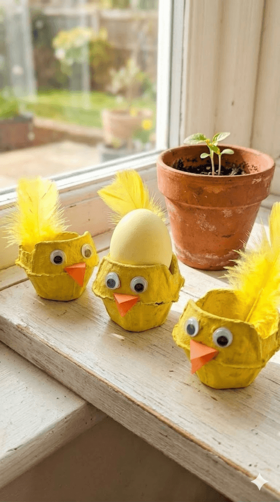 Description: A playful, eco-friendly craft for kids using recycled egg cartons, yellow paint, and fluffy feathers. It’s a great way to keep little hands busy on a rainy spring afternoon.