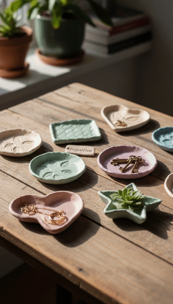 Colorful handmade air dry clay trinket dishes arranged on a rustic wooden table, featuring heart, star, square, oval, and leaf shapes in soft pastel and earthy tones. The dishes include textured designs, simple patterns, and one oval dish engraved with the word HypeVine, styled as decorative jewelry catchalls for a calm, creative home craft vibe.