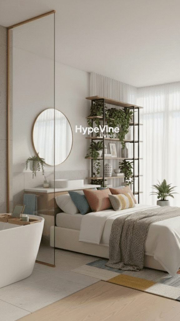 • Use wall-mounted shelves for books, plants, and decor