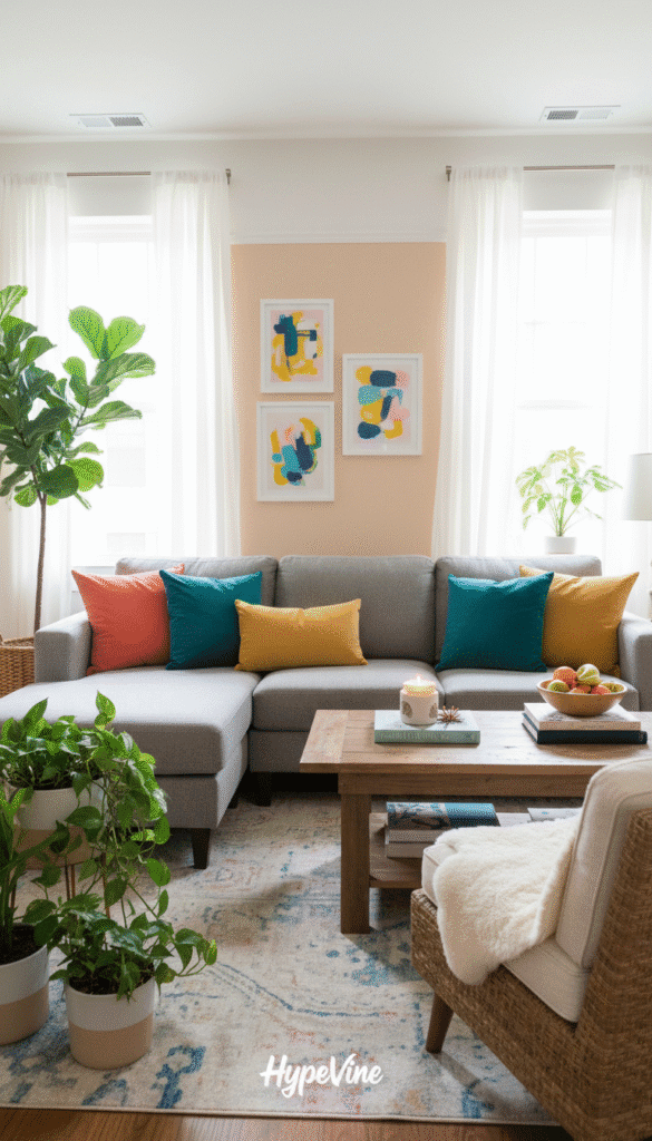 A cozy, budget-friendly living room featuring DIY home decor ideas. In the foreground, a simple, chic coffee table is adorned with a handmade pottery vase filled with fresh wildflowers. In the middle, a comfortable couch draped with colorful throw blankets and embroidered cushions creates an inviting atmosphere, complemented by a stylish, woven area rug. The background showcases soft, natural light streaming through a large window, illuminating plants strategically placed on a shelf. The scene is designed to evoke a relaxed, lived-in feel, with a harmonious color palette of earthy tones and vibrant accents. Include HypeVine branding subtly integrated into the decor. Capture this scene from a slightly elevated angle to emphasize the layout and use a warm, bright lighting effect to enhance the inviting mood.